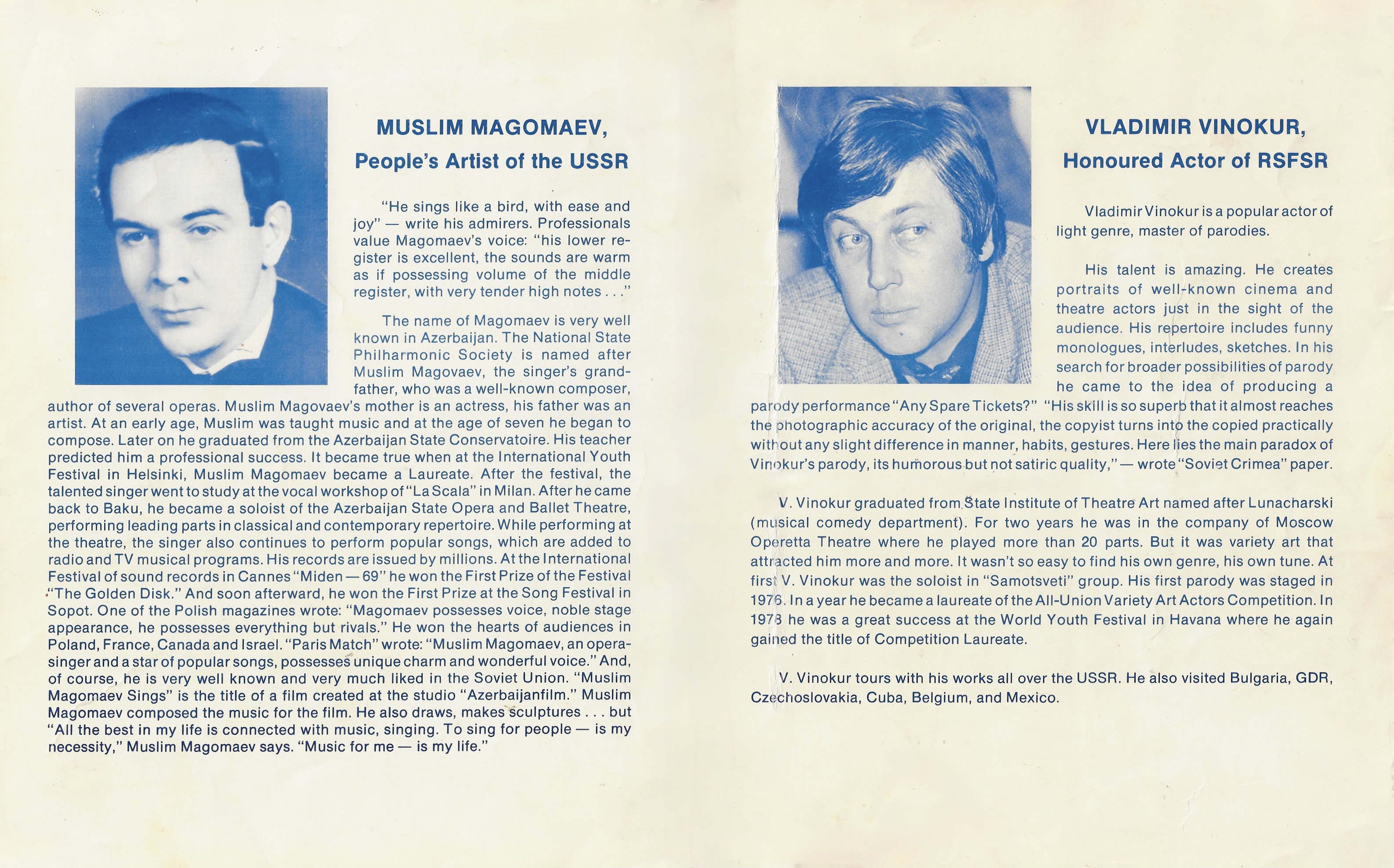 History K.F. Grinasyuk Y.V. Bryushkov N. Antonova G.M. Buze and Class P. Serebriakov V.P. Bezruchenko Sokolov Yuri Silantiev V. Khalilov A. Petukhov R. Pauls M. Magomayev V. Vinokur K. Fedicheva K. Fedicheva Kaleria Fedicheva with Simon Polezhayev Share this: Click to share on X (Opens in new window) X Click to share on Facebook (Opens in new window) Facebook Like Loading...