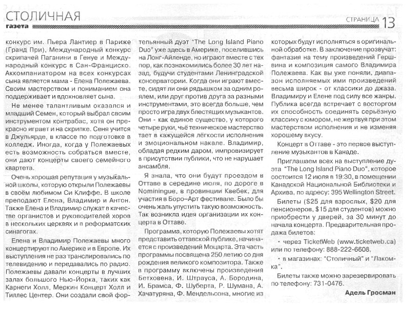 Press 10-21-1992 Newsday 12346-15-1997 NY Times10-04-1998 Italian07-18-2002 Russian 121-18-2004 NY TimesSep 2004, Koln Germany – RussianSep 2004, Koln Germany – GermanAug 200807-22-2006 CanadaJan 2007 Canada, Russian02-07-2007 Canada, Russian Share this: Click to share on X (Opens in new window) X Click to share on Facebook (Opens in new window) Facebook Like Loading...